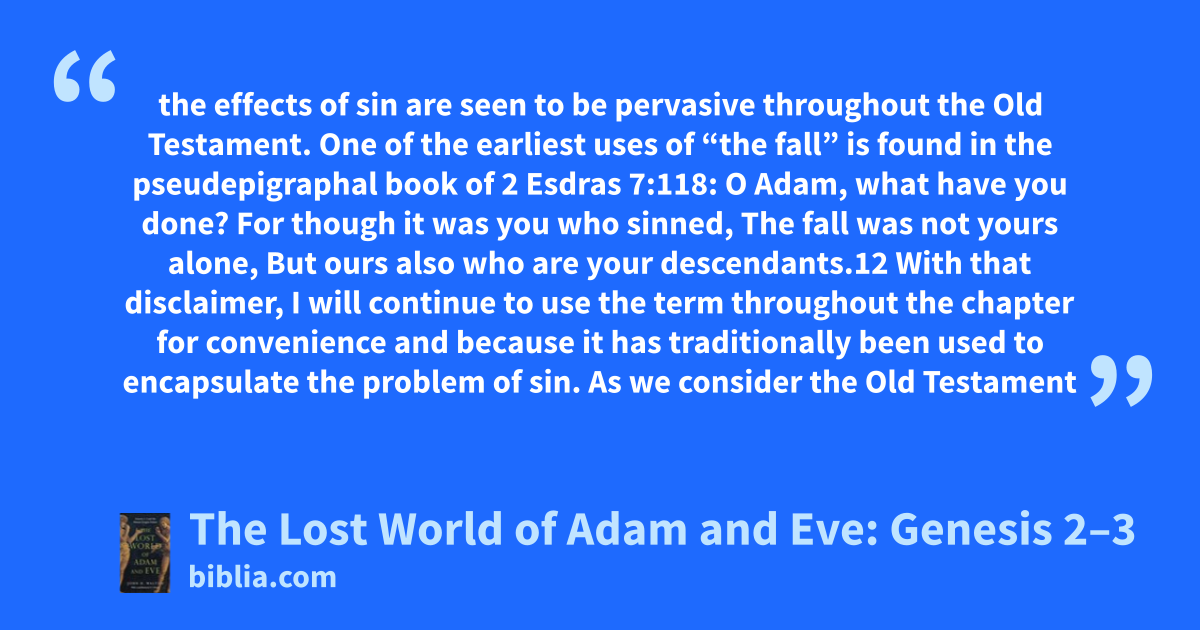 the effects of sin are seen to be pervasive throughout the Old Testament. One of the earliest uses of “the fall” is found in the pseudepigraphal book of 2 Esdras 7:118: O Adam, what have you done? For though it was you who sinned, The fall was not yours alone, But ours also who are your descendants.12 With that disclaimer, I will continue to use the term throughout the chapter for convenience and because it has traditionally been used to encapsulate the problem of sin. As we consider the Old Testament