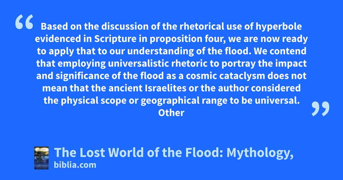 Based on the discussion of the rhetorical use of hyperbole evidenced in Scripture in proposition four, we are now ready to apply that to our understanding of the flood. We contend that employing universalistic rhetoric to portray the impact and significance of the flood as a cosmic cataclysm does not mean that the ancient Israelites or the author considered the physical scope or geographical range to be universal. Other