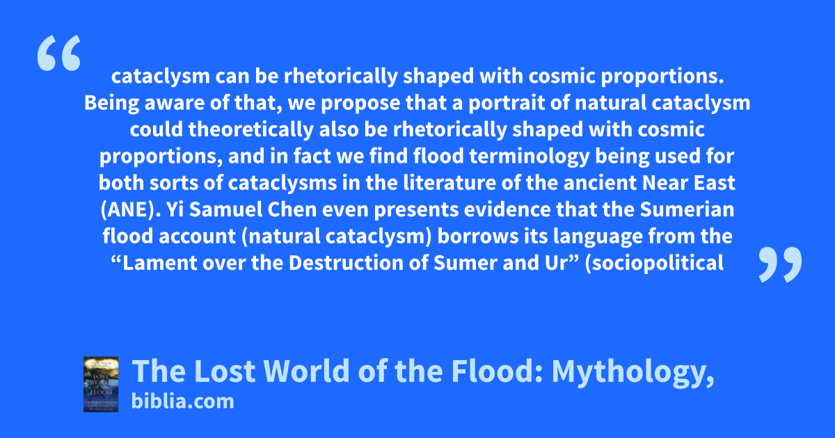 cataclysm can be rhetorically shaped with cosmic proportions. Being aware of that, we propose that a portrait of natural cataclysm could theoretically also be rhetorically shaped with cosmic proportions, and in fact we find flood terminology being used for both sorts of cataclysms in the literature of the ancient Near East (ANE). Yi Samuel Chen even presents evidence that the Sumerian flood account (natural cataclysm) borrows its language from the “Lament over the Destruction of Sumer and Ur” (sociopolitical