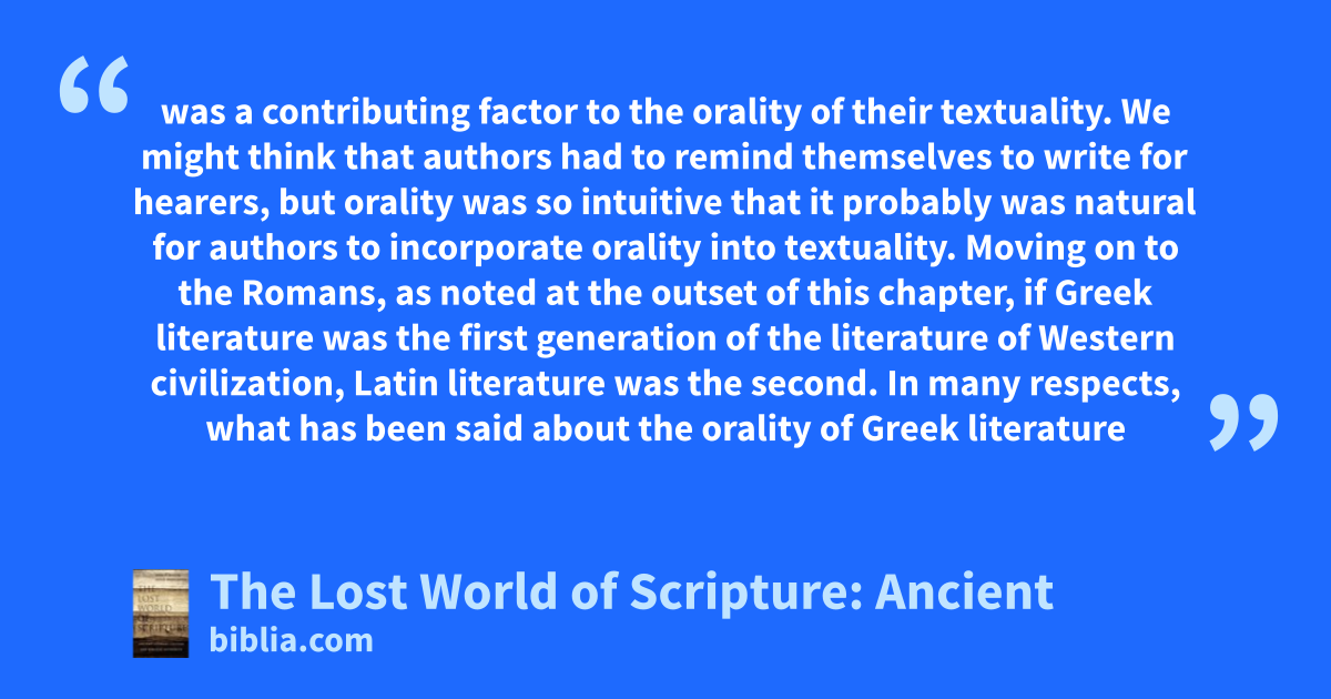was a contributing factor to the orality of their textuality. We might think that authors had to remind themselves to write for hearers, but orality was so intuitive that it probably was natural for authors to incorporate orality into textuality. Moving on to the Romans, as noted at the outset of this chapter, if Greek literature was the first generation of the literature of Western civilization, Latin literature was the second. In many respects, what has been said about the orality of Greek literature