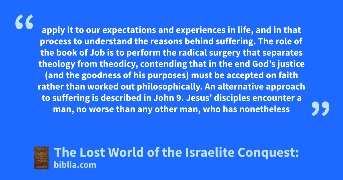 apply it to our expectations and experiences in life, and in that process to understand the reasons behind suffering. The role of the book of Job is to perform the radical surgery that separates theology from theodicy, contending that in the end God’s justice (and the goodness of his purposes) must be accepted on faith rather than worked out philosophically. An alternative approach to suffering is described in John 9. Jesus’ disciples encounter a man, no worse than any other man, who has nonetheless