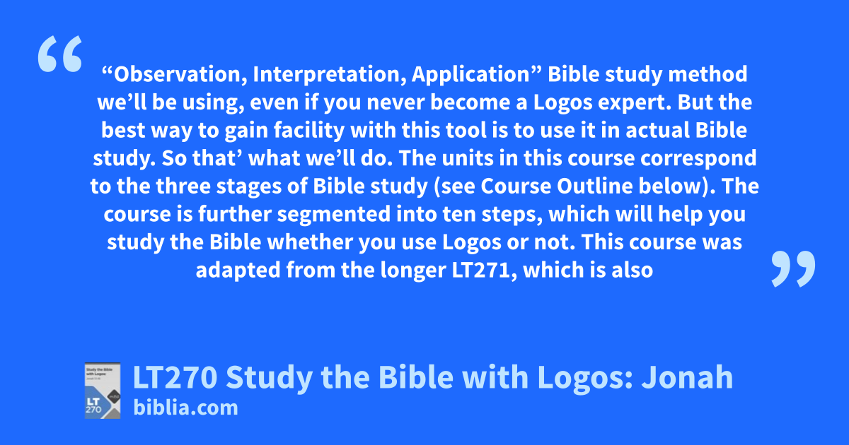 This course was designed to help you study the Bible. That’s its first purpose. But part of learning how to study is learning to use your tools well, so we have included substantial instruction on the use of Logos Bible Software as well. Studying the Bible with Logos can be as simple as typing a passage or topic in a box and hitting enter. It’s an ideal tool for the “Observation, Interpretation,...