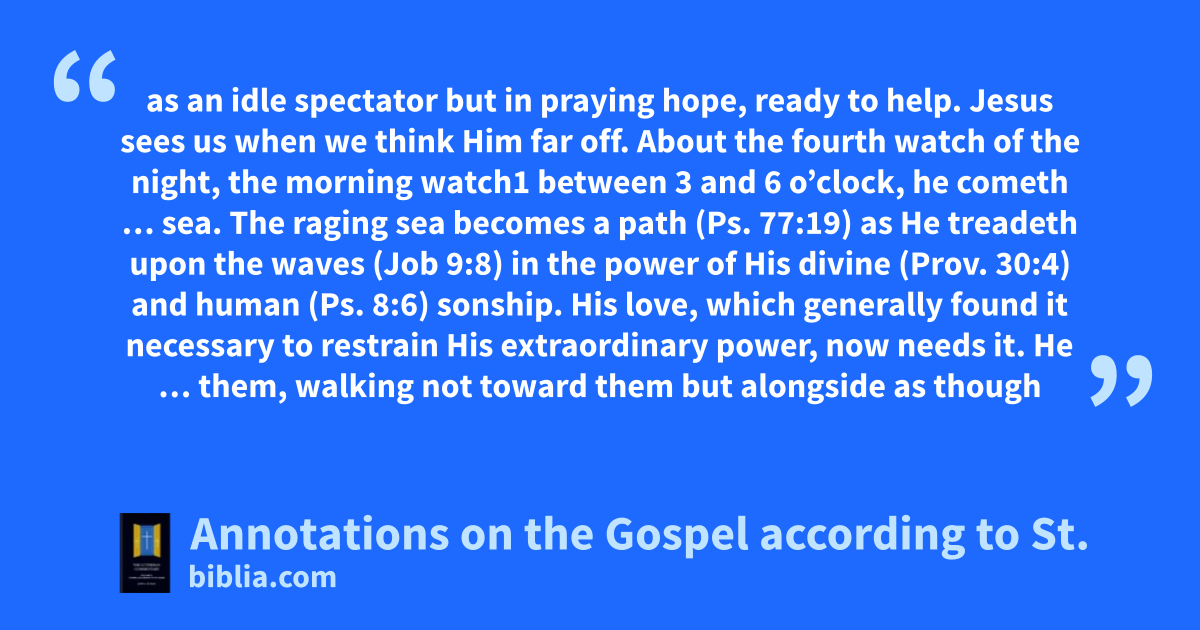 as an idle spectator but in praying hope, ready to help. Jesus sees us when we think Him far off. About the fourth watch of the night, the morning watch1 between 3 and 6 o’clock, he cometh … sea. The raging sea becomes a path (Ps. 77:19) as He treadeth upon the waves (Job 9:8) in the power of His divine (Prov. 30:4) and human (Ps. 8:6) sonship. His love, which generally found it necessary to restrain His extraordinary power, now needs it. He … them, walking not toward them but alongside as though