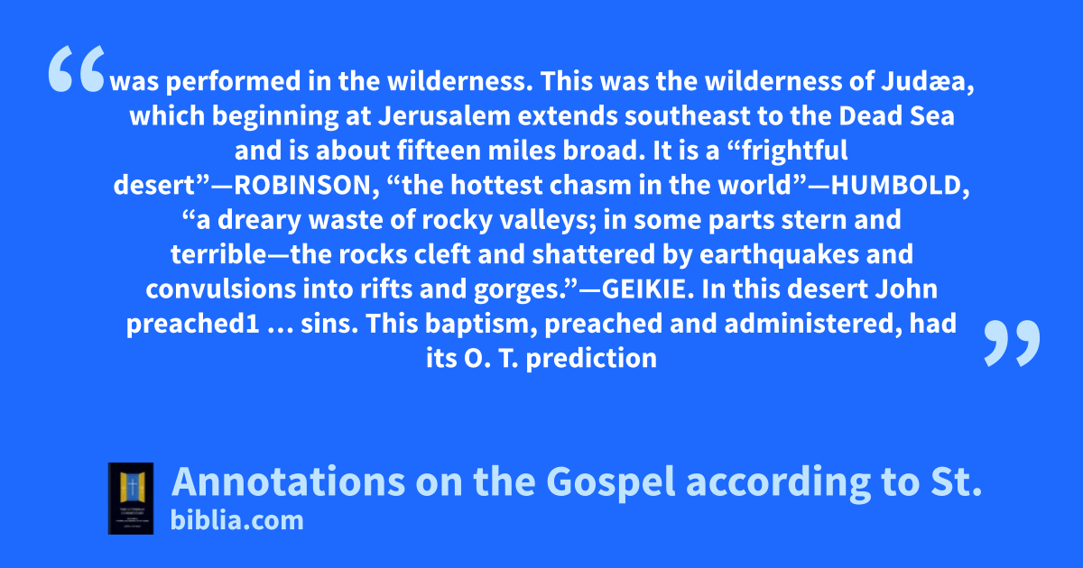 was performed in the wilderness. This was the wilderness of Judæa, which beginning at Jerusalem extends southeast to the Dead Sea and is about fifteen miles broad. It is a “frightful desert”—ROBINSON, “the hottest chasm in the world”—HUMBOLD, “a dreary waste of rocky valleys; in some parts stern and terrible—the rocks cleft and shattered by earthquakes and convulsions into rifts and gorges.”—GEIKIE. In this desert John preached1 … sins. This baptism, preached and administered, had its O. T. prediction