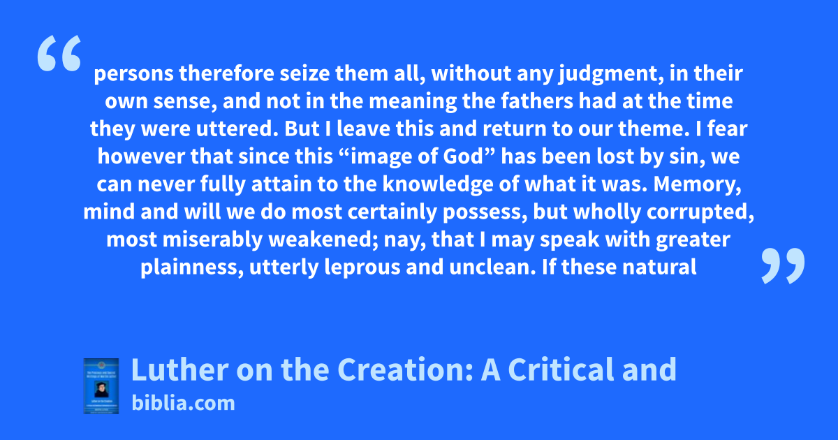 persons therefore seize them all, without any judgment, in their own sense, and not in the meaning the fathers had at the time they were uttered. But I leave this and return to our theme. I fear however that since this “image of God” has been lost by sin, we can never fully attain to the knowledge of what it was. Memory, mind and will we do most certainly possess, but wholly corrupted, most miserably weakened; nay, that I may speak with greater plainness, utterly leprous and unclean. If these natural