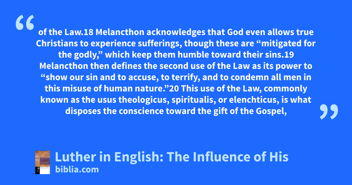 of the Law.18 Melancthon acknowledges that God even allows true Christians to experience sufferings, though these are “mitigated for the godly,” which keep them humble toward their sins.19 Melancthon then defines the second use of the Law as its power to “show our sin and to accuse, to terrify, and to condemn all men in this misuse of human nature.”20 This use of the Law, commonly known as the usus theologicus, spiritualis, or elenchticus, is what disposes the conscience toward the gift of the Gospel,