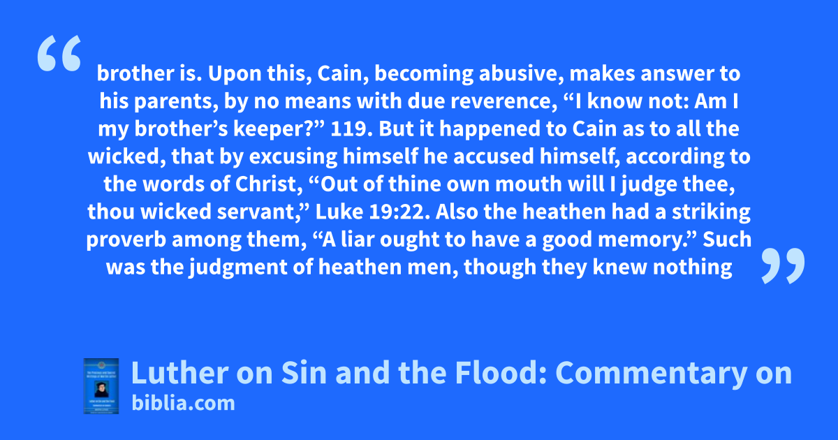 brother is. Upon this, Cain, becoming abusive, makes answer to his parents, by no means with due reverence, “I know not: Am I my brother’s keeper?” 119. But it happened to Cain as to all the wicked, that by excusing himself he accused himself, according to the words of Christ, “Out of thine own mouth will I judge thee, thou wicked servant,” Luke 19:22. Also the heathen had a striking proverb among them, “A liar ought to have a good memory.” Such was the judgment of heathen men, though they knew nothing