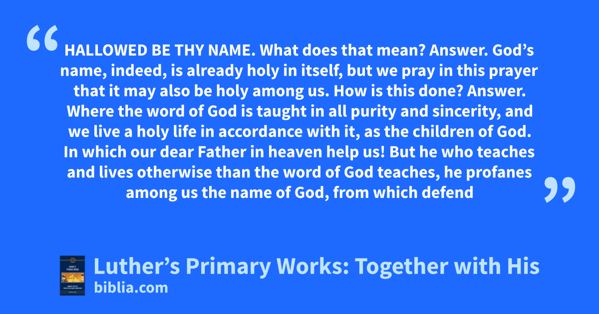 HALLOWED BE THY NAME. What does that mean? Answer. God’s name, indeed, is already holy in itself, but we pray in this prayer that it may also be holy among us. How is this done? Answer. Where the word of God is taught in all purity and sincerity, and we live a holy life in accordance with it, as the children of God. In which our dear Father in heaven help us! But he who teaches and lives otherwise than the word of God teaches, he profanes among us the name of God, from which defend