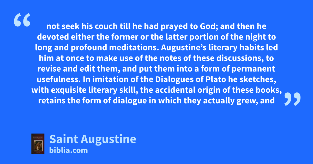 not seek his couch till he had prayed to God; and then he devoted either the former or the latter portion of the night to long and profound meditations. Augustine’s literary habits led him at once to make use of the notes of these discussions, to revise and edit them, and put them into a form of permanent usefulness. In imitation of the Dialogues of Plato he sketches, with exquisite literary skill, the accidental origin of these books, retains the form of dialogue in which they actually grew, and