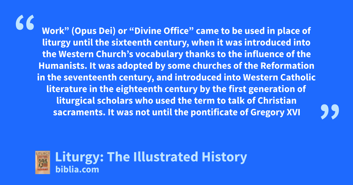 Work” (Opus Dei) or “Divine Office” came to be used in place of liturgy until the sixteenth century, when it was introduced into the Western Church’s vocabulary thanks to the influence of the Humanists. It was adopted by some churches of the Reformation in the seventeenth century, and introduced into Western Catholic literature in the eighteenth century by the first generation of liturgical scholars who used the term to talk of Christian sacraments. It was not until the pontificate of Gregory XVI