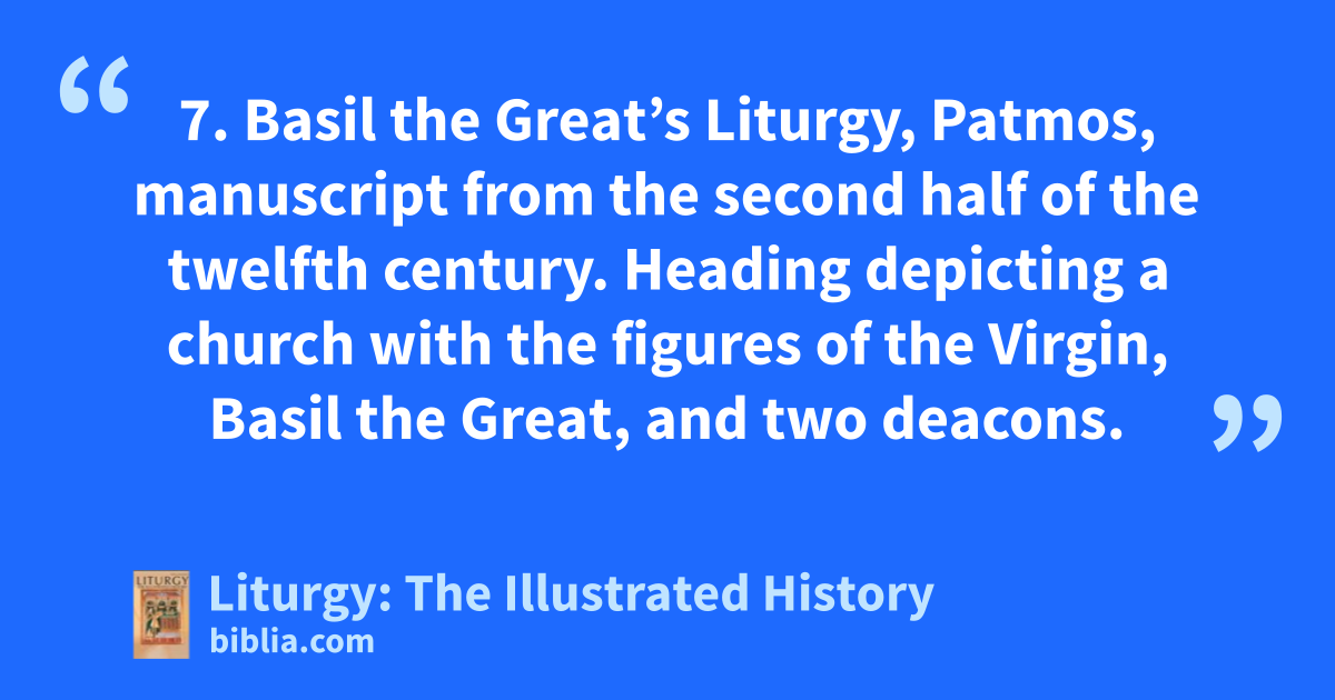7. Basil the Great’s Liturgy, Patmos, manuscript from the second half of the twelfth century. Heading depicting a church with the figures of the Virgin, Basil the Great, and two deacons.