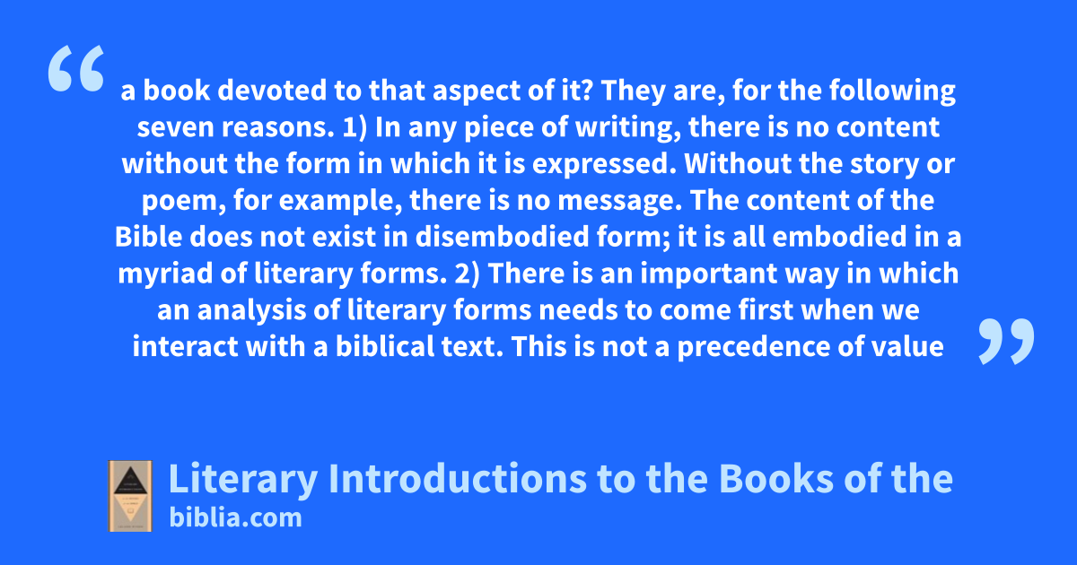 a book devoted to that aspect of it? They are, for the following seven reasons. 1) In any piece of writing, there is no content without the form in which it is expressed. Without the story or poem, for example, there is no message. The content of the Bible does not exist in disembodied form; it is all embodied in a myriad of literary forms. 2) There is an important way in which an analysis of literary forms needs to come first when we interact with a biblical text. This is not a precedence of value