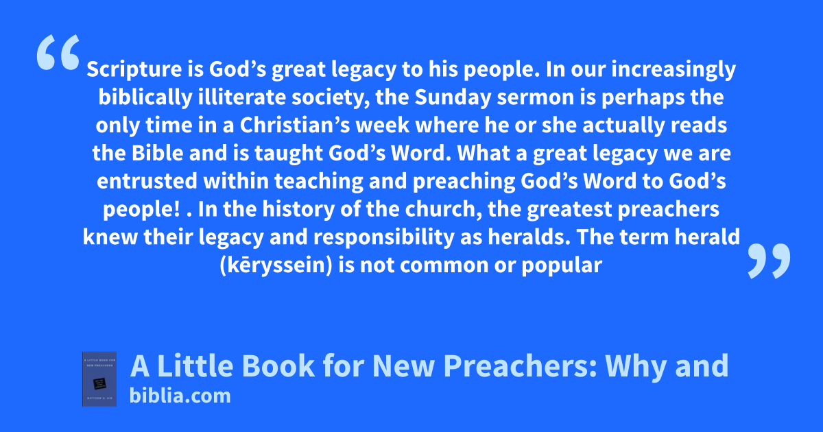 Scripture is God’s great legacy to his people. In our increasingly biblically illiterate society, the Sunday sermon is perhaps the only time in a Christian’s week where he or she actually reads the Bible and is taught God’s Word. What a great legacy we are entrusted within teaching and preaching God’s Word to God’s people! . In the history of the church, the greatest preachers knew their legacy and responsibility as heralds. The term herald (kēryssein) is not common or popular