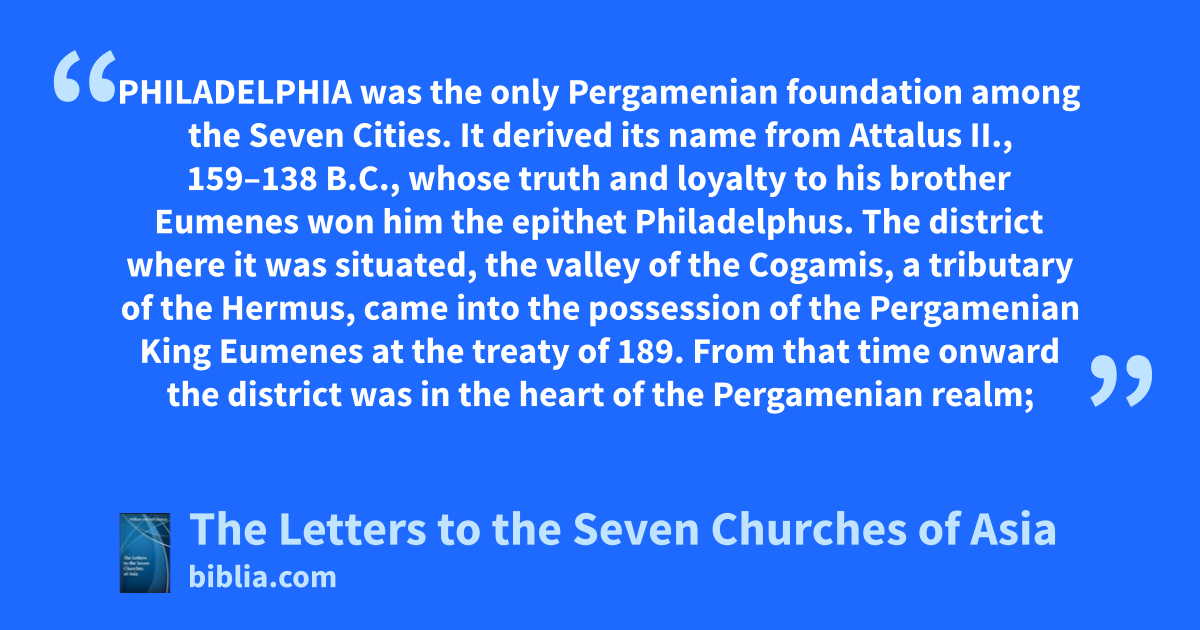 PHILADELPHIA was the only Pergamenian foundation among the Seven Cities. It derived its name from Attalus II., 159–138 B.C., whose truth and loyalty to his brother Eumenes won him the epithet Philadelphus. The district where it was situated, the valley of the Cogamis, a tributary of the Hermus, came into the possession of the Pergamenian King Eumenes at the treaty of 189. From that time onward the district was in the heart of the Pergamenian realm;