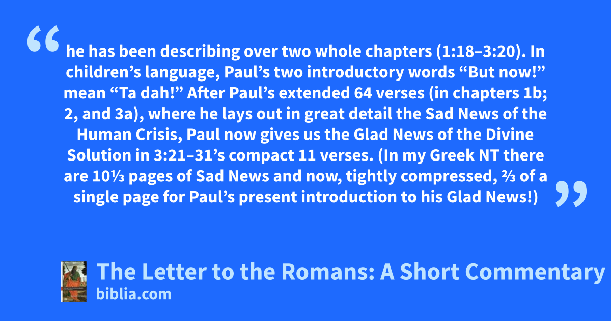 he has been describing over two whole chapters (1:18–3:20). In children’s language, Paul’s two introductory words “But now!” mean “Ta dah!” After Paul’s extended 64 verses (in chapters 1b; 2, and 3a), where he lays out in great detail the Sad News of the Human Crisis, Paul now gives us the Glad News of the Divine Solution in 3:21–31’s compact 11 verses. (In my Greek NT there are 10⅓ pages of Sad News and now, tightly compressed, ⅔ of a single page for Paul’s present introduction to his Glad News!)