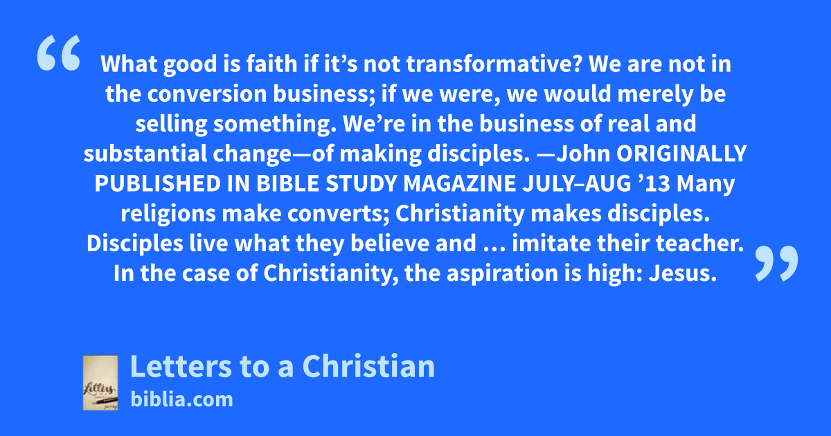 What good is faith if it’s not transformative? We are not in the conversion business; if we were, we would merely be selling something. We’re in the business of real and substantial change—of making disciples. —John ORIGINALLY PUBLISHED IN BIBLE STUDY MAGAZINE JULY–AUG ’13 Many religions make converts; Christianity makes disciples. Disciples live what they believe and … imitate their teacher. In the case of Christianity, the aspiration is high: Jesus.
