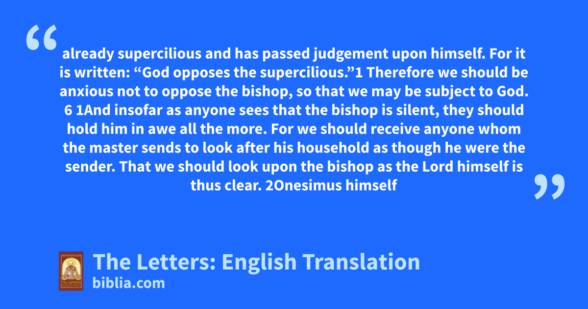 already supercilious and has passed judgement upon himself. For it is written: “God opposes the supercilious.”1 Therefore we should be anxious not to oppose the bishop, so that we may be subject to God. 6 1And insofar as anyone sees that the bishop is silent, they should hold him in awe all the more. For we should receive anyone whom the master sends to look after his household as though he were the sender. That we should look upon the bishop as the Lord himself is thus clear. 2Onesimus himself