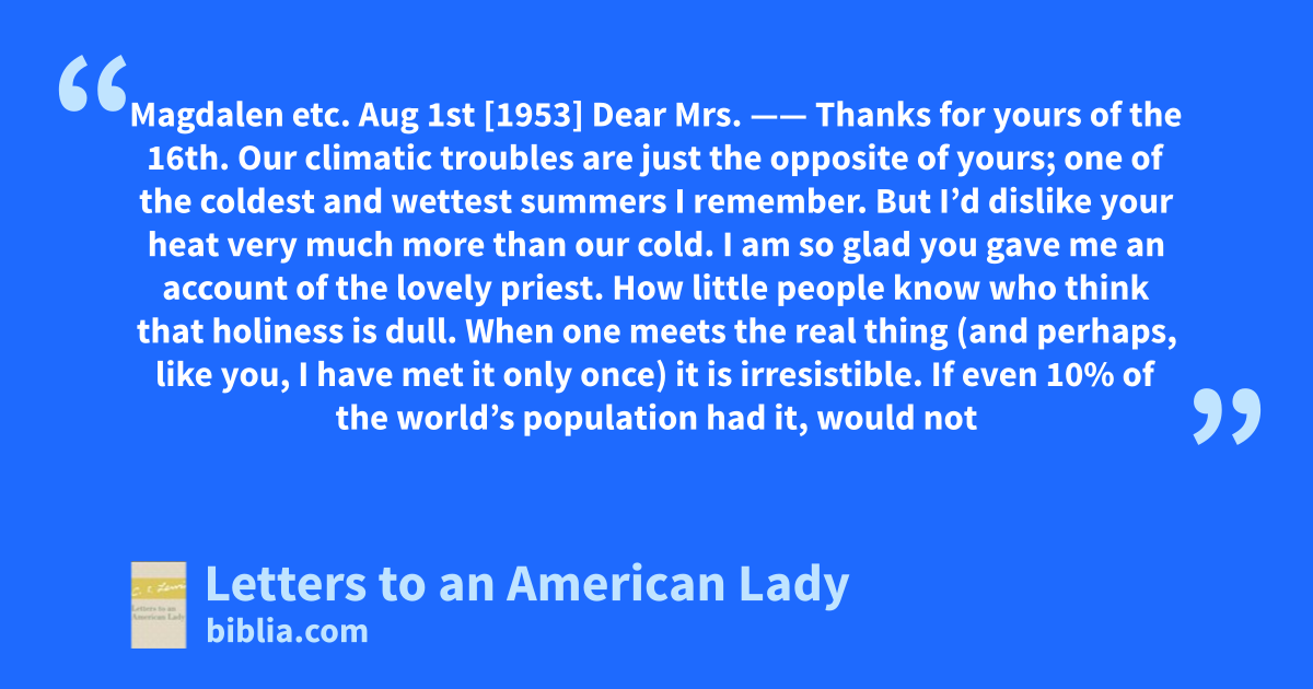 Magdalen etc. Aug 1st [1953] Dear Mrs. —— Thanks for yours of the 16th. Our climatic troubles are just the opposite of yours; one of the coldest and wettest summers I remember. But I’d dislike your heat very much more than our cold. I am so glad you gave me an account of the lovely priest. How little people know who think that holiness is dull. When one meets the real thing (and perhaps, like you, I have met it only once) it is irresistible. If even 10% of the world’s population had it, would not