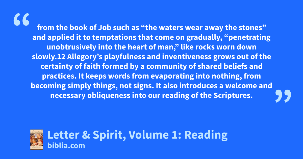 from the book of Job such as “the waters wear away the stones” and applied it to temptations that come on gradually, “penetrating unobtrusively into the heart of man,” like rocks worn down slowly.12 Allegory’s playfulness and inventiveness grows out of the certainty of faith formed by a community of shared beliefs and practices. It keeps words from evaporating into nothing, from becoming simply things, not signs. It also introduces a welcome and necessary obliqueness into our reading of the Scriptures.