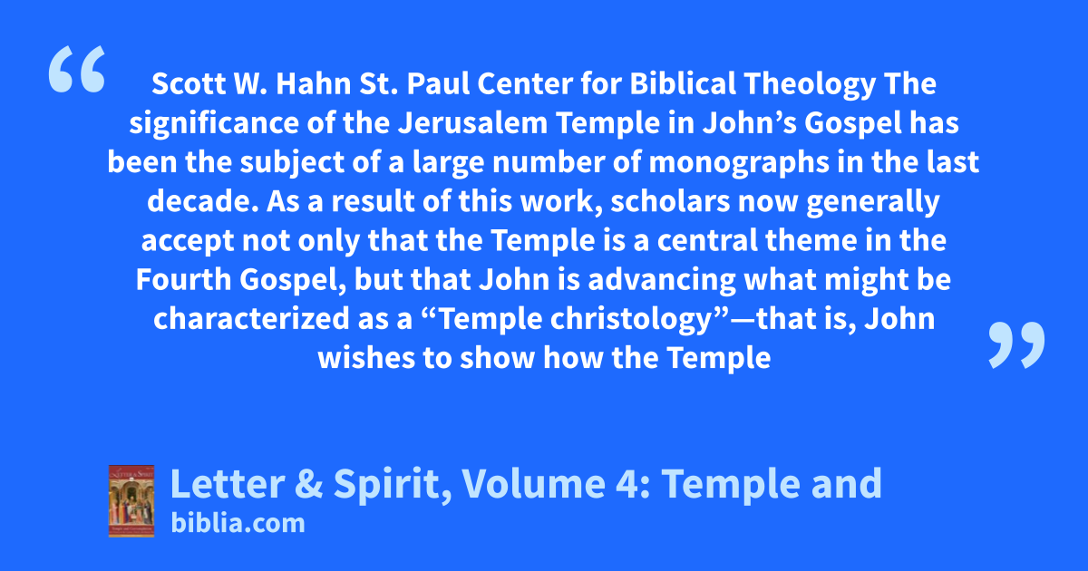 Scott W. Hahn St. Paul Center for Biblical Theology The significance of the Jerusalem Temple in John’s Gospel has been the subject of a large number of monographs in the last decade. As a result of this work, scholars now generally accept not only that the Temple is a central theme in the Fourth Gospel, but that John is advancing what might be characterized as a “Temple christology”—that is, John wishes to show how the Temple