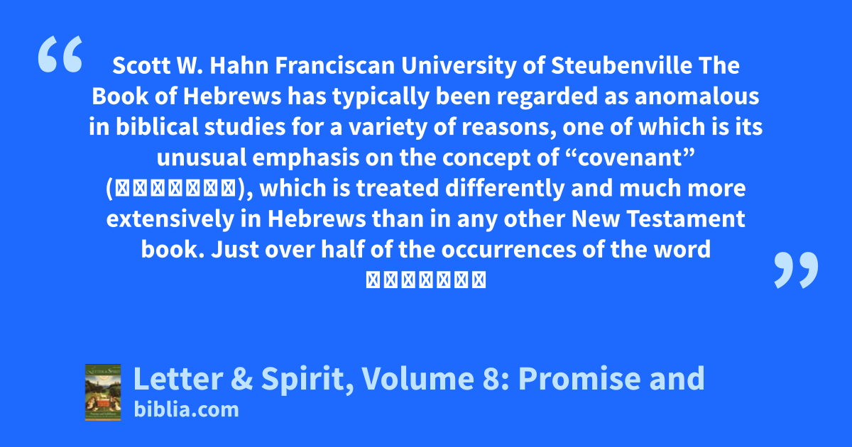 Scott W. Hahn Franciscan University of Steubenville The Book of Hebrews has typically been regarded as anomalous in biblical studies for a variety of reasons, one of which is its unusual emphasis on the concept of “covenant” (διαθήκη), which is treated differently and much more extensively in Hebrews than in any other New Testament book. Just over half of the occurrences of the word διαθήκη