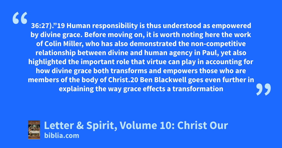 36:27).”19 Human responsibility is thus understood as empowered by divine grace. Before moving on, it is worth noting here the work of Colin Miller, who has also demonstrated the non-competitive relationship between divine and human agency in Paul, yet also highlighted the important role that virtue can play in accounting for how divine grace both transforms and empowers those who are members of the body of Christ.20 Ben Blackwell goes even further in explaining the way grace effects a transformation