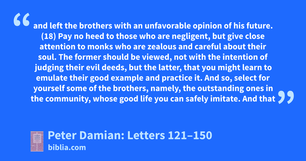 and left the brothers with an unfavorable opinion of his future. (18) Pay no heed to those who are negligent, but give close attention to monks who are zealous and careful about their soul. The former should be viewed, not with the intention of judging their evil deeds, but the latter, that you might learn to emulate their good example and practice it. And so, select for yourself some of the brothers, namely, the outstanding ones in the community, whose good life you can safely imitate. And that