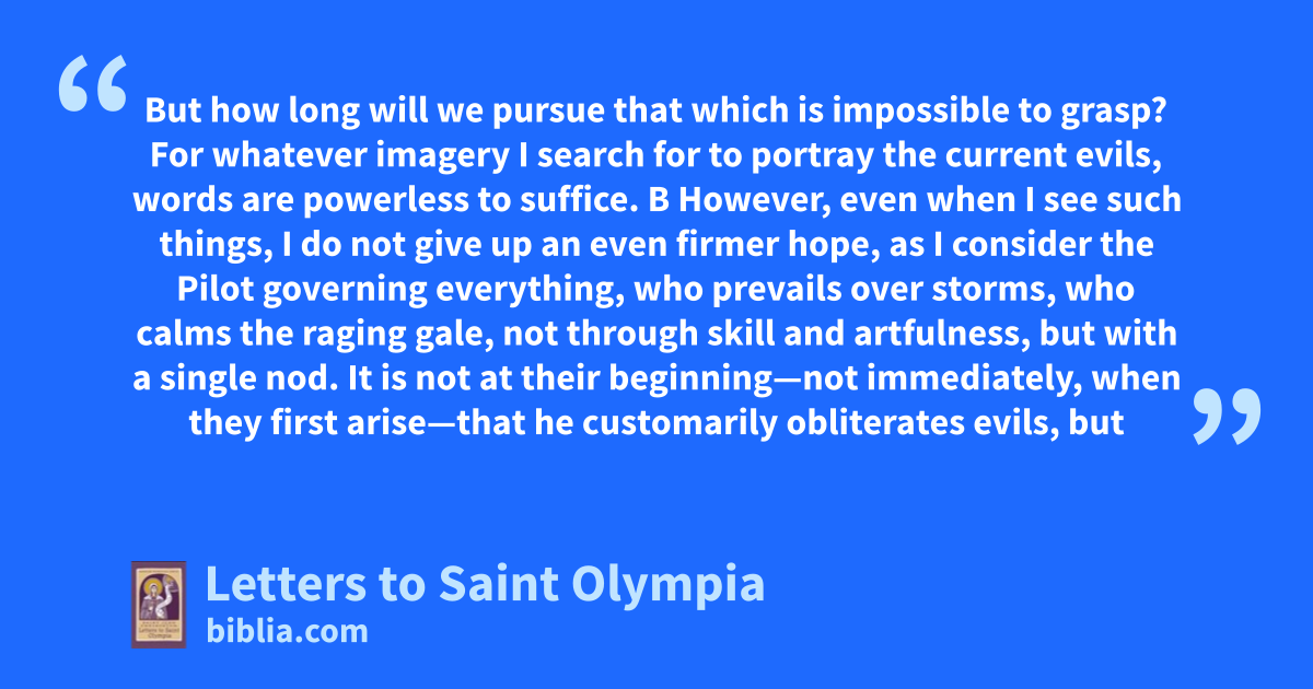 But how long will we pursue that which is impossible to grasp? For whatever imagery I search for to portray the current evils, words are powerless to suffice. B However, even when I see such things, I do not give up an even firmer hope, as I consider the Pilot governing everything, who prevails over storms, who calms the raging gale, not through skill and artfulness, but with a single nod. It is not at their beginning—not immediately, when they first arise—that he customarily obliterates evils, but
