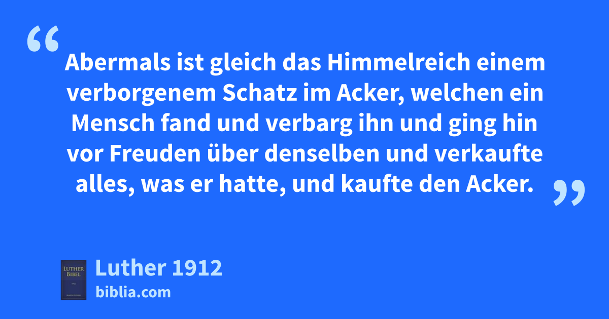 44. Abermals ist gleich das Himmelreich einem verborgenem Schatz im Acker, welchen ein Mensch fand und verbarg ihn und ging hin vor Freuden über denselben und verkaufte alles, was er hatte, und kaufte den Acker.