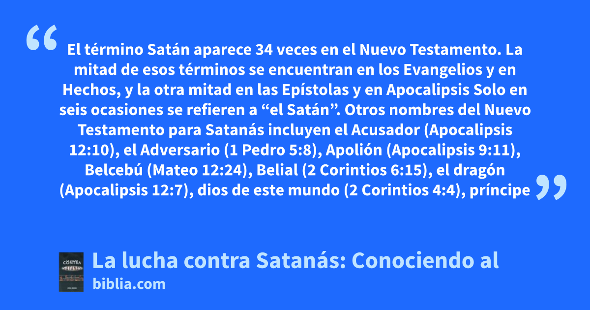 El término Satán aparece 34 veces en el Nuevo Testamento. La mitad de esos términos se encuentran en los Evangelios y en Hechos, y la otra mitad en las Epístolas y en Apocalipsis Solo en seis ocasiones se refieren a “el Satán”. Otros nombres del Nuevo Testamento para Satanás incluyen el Acusador (Apocalipsis 12:10), el Adversario (1 Pedro 5:8), Apolión (Apocalipsis 9:11), Belcebú (Mateo 12:24), Belial (2 Corintios 6:15), el dragón (Apocalipsis 12:7), dios de este mundo (2 Corintios 4:4), príncipe