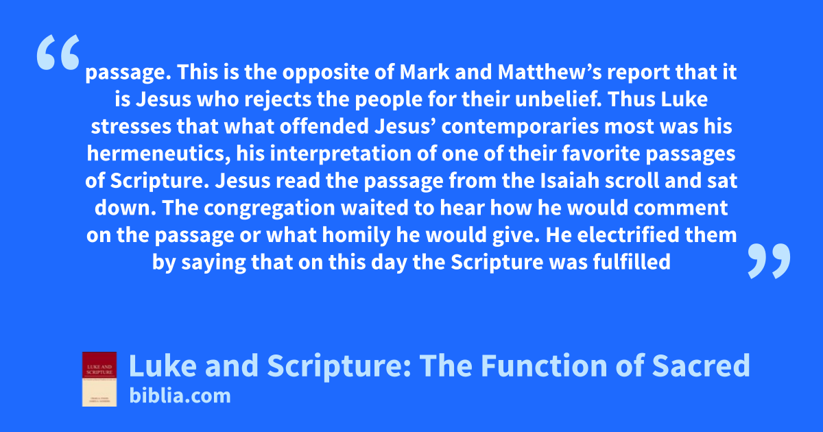 passage. This is the opposite of Mark and Matthew’s report that it is Jesus who rejects the people for their unbelief. Thus Luke stresses that what offended Jesus’ contemporaries most was his hermeneutics, his interpretation of one of their favorite passages of Scripture. Jesus read the passage from the Isaiah scroll and sat down. The congregation waited to hear how he would comment on the passage or what homily he would give. He electrified them by saying that on this day the Scripture was fulfilled