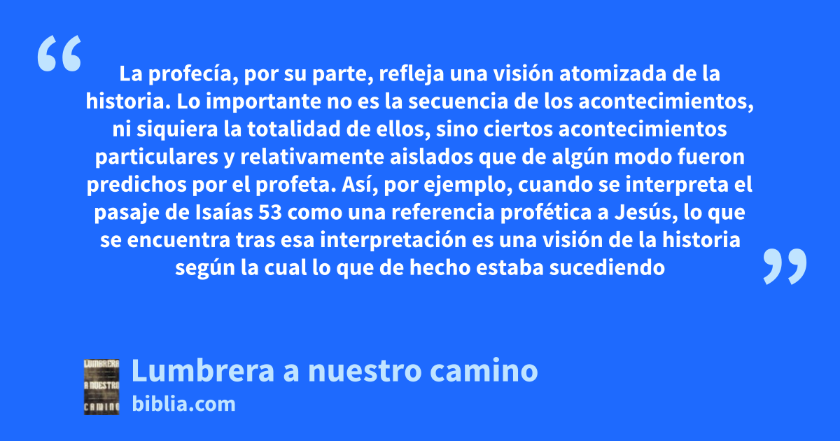 La profecía, por su parte, refleja una visión atomizada de la historia. Lo importante no es la secuencia de los acontecimientos, ni siquiera la totalidad de ellos, sino ciertos acontecimientos particulares y relativamente aislados que de algún modo fueron predichos por el profeta. Así, por ejemplo, cuando se interpreta el pasaje de Isaías 53 como una referencia profética a Jesús, lo que se encuentra tras esa interpretación es una visión de la historia según la cual lo que de hecho estaba sucediendo