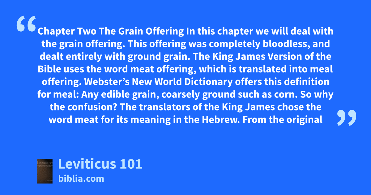 Chapter Two The Grain Offering In this chapter we will deal with the grain offering. This offering was completely bloodless, and dealt entirely with ground grain. The King James Version of the Bible uses the word meat offering, which is translated into meal offering. Webster’s New World Dictionary offers this definition for meal: Any edible grain, coarsely ground such as corn. So why the confusion? The translators of the King James chose the word meat for its meaning in the Hebrew. From the original