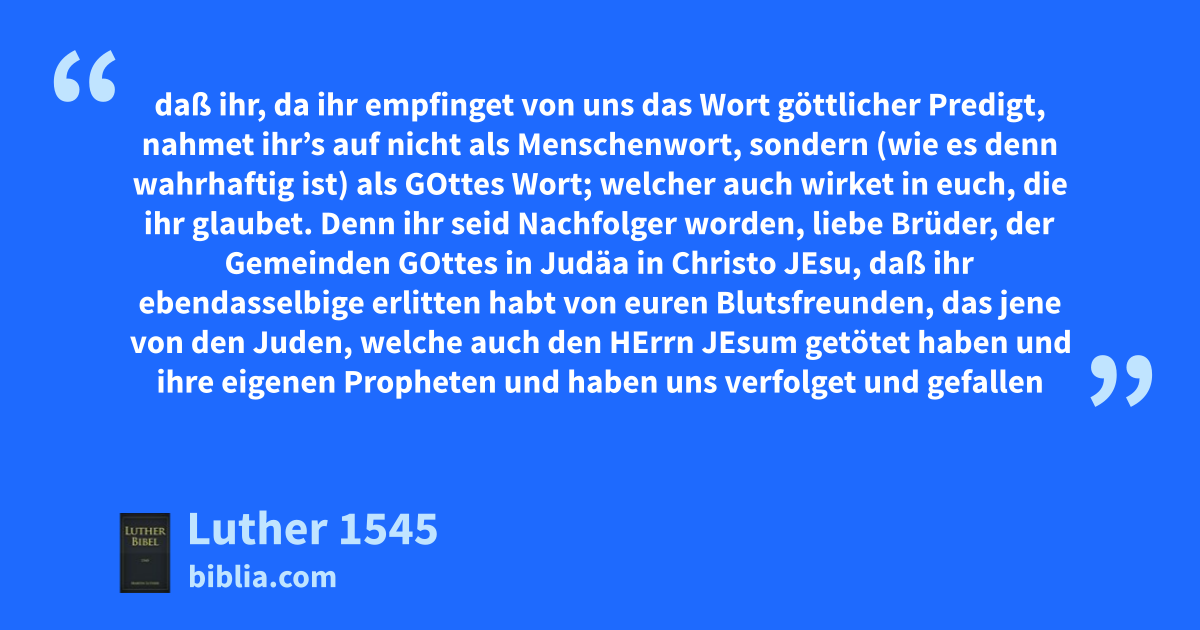daß ihr, da ihr empfinget von uns das Wort göttlicher Predigt, nahmet ihr’s auf nicht als Menschenwort, sondern (wie es denn wahrhaftig ist) als GOttes Wort; welcher auch wirket in euch, die ihr glaubet. Denn ihr seid Nachfolger worden, liebe Brüder, der Gemeinden GOttes in Judäa in Christo JEsu, daß ihr ebendasselbige erlitten habt von euren Blutsfreunden, das jene von den Juden, welche auch den HErrn JEsum getötet haben und ihre eigenen Propheten und haben uns verfolget und gefallen