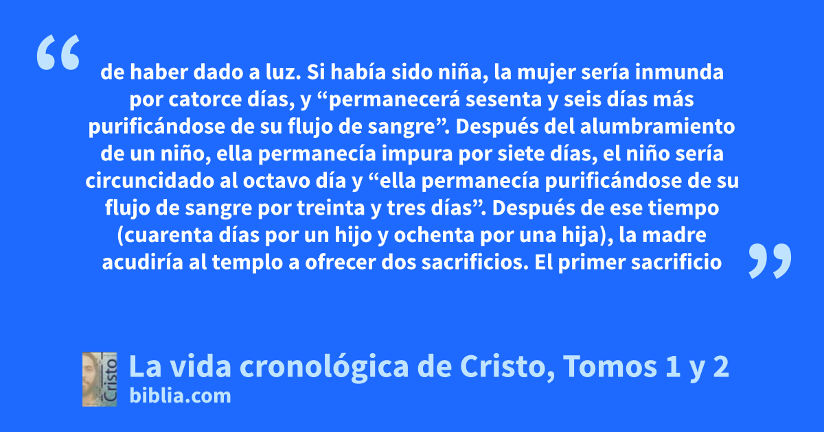 de haber dado a luz. Si había sido niña, la mujer sería inmunda por catorce días, y “permanecerá sesenta y seis días más purificándose de su flujo de sangre”. Después del alumbramiento de un niño, ella permanecía impura por siete días, el niño sería circuncidado al octavo día y “ella permanecía purificándose de su flujo de sangre por treinta y tres días”. Después de ese tiempo (cuarenta días por un hijo y ochenta por una hija), la madre acudiría al templo a ofrecer dos sacrificios. El primer sacrificio