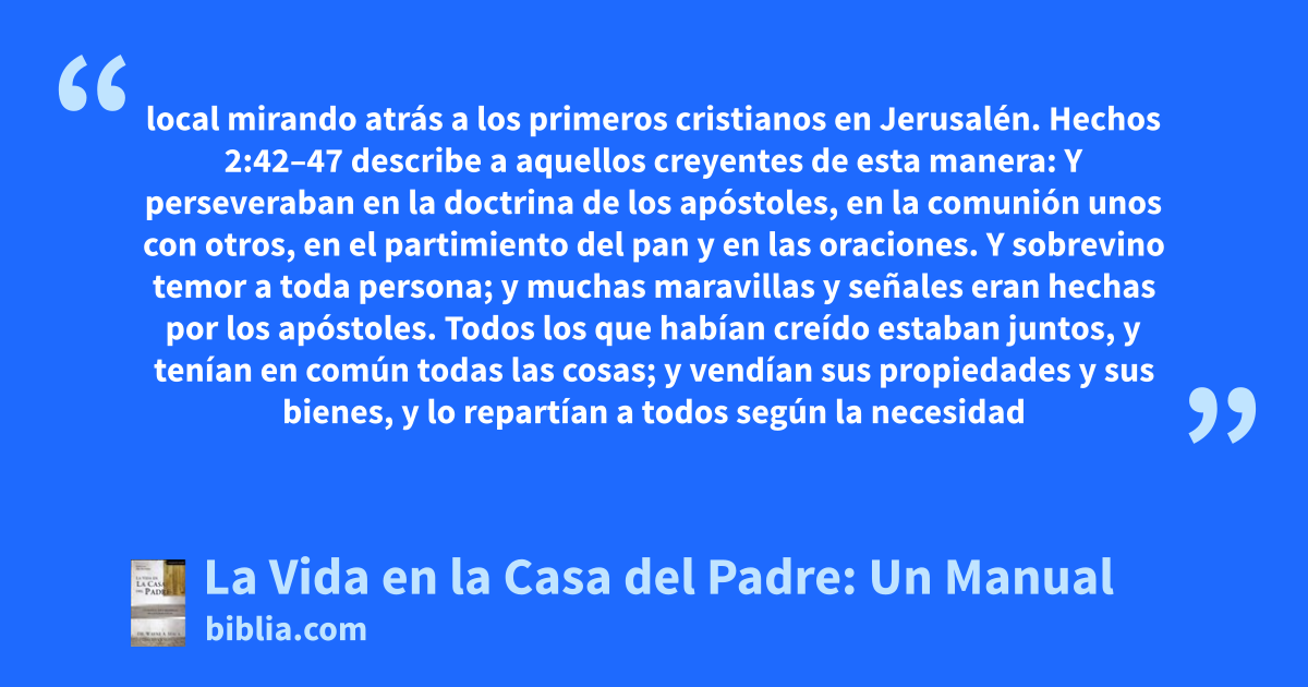 local mirando atrás a los primeros cristianos en Jerusalén. Hechos 2:42–47 describe a aquellos creyentes de esta manera: Y perseveraban en la doctrina de los apóstoles, en la comunión unos con otros, en el partimiento del pan y en las oraciones. Y sobrevino temor a toda persona; y muchas maravillas y señales eran hechas por los apóstoles. Todos los que habían creído estaban juntos, y tenían en común todas las cosas; y vendían sus propiedades y sus bienes, y lo repartían a todos según la necesidad