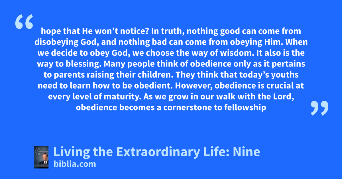 hope that He won’t notice? In truth, nothing good can come from disobeying God, and nothing bad can come from obeying Him. When we decide to obey God, we choose the way of wisdom. It also is the way to blessing. Many people think of obedience only as it pertains to parents raising their children. They think that today’s youths need to learn how to be obedient. However, obedience is crucial at every level of maturity. As we grow in our walk with the Lord, obedience becomes a cornerstone to fellowship