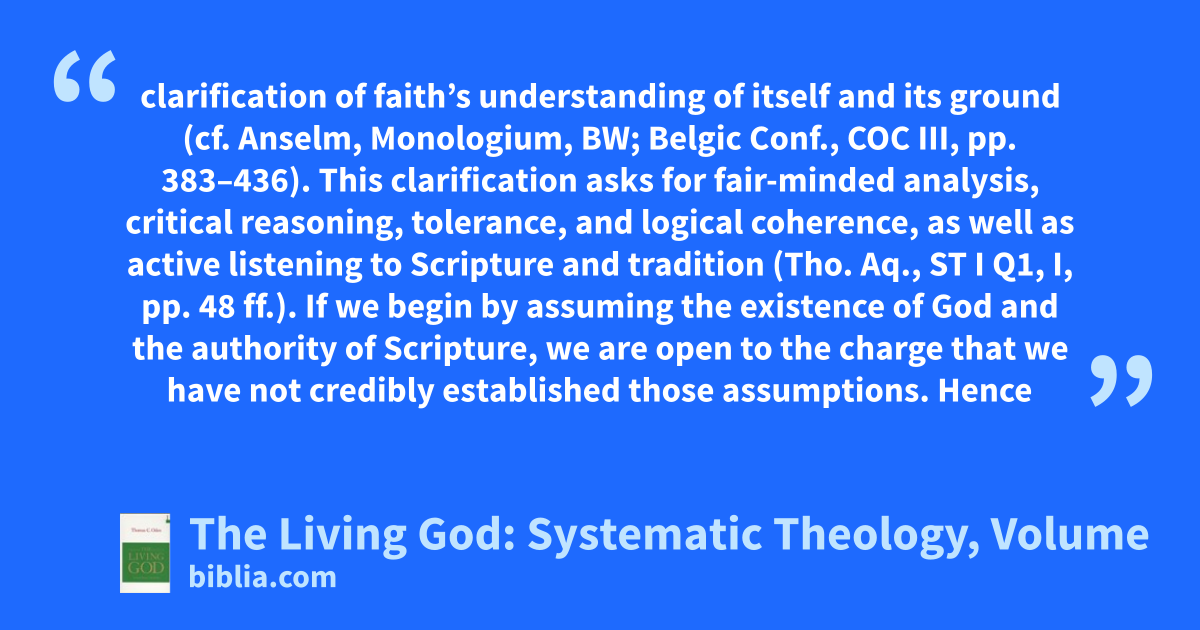 clarification of faith’s understanding of itself and its ground (cf. Anselm, Monologium, BW; Belgic Conf., COC III, pp. 383–436). This clarification asks for fair-minded analysis, critical reasoning, tolerance, and logical coherence, as well as active listening to Scripture and tradition (Tho. Aq., ST I Q1, I, pp. 48 ff.). If we begin by assuming the existence of God and the authority of Scripture, we are open to the charge that we have not credibly established those assumptions. Hence