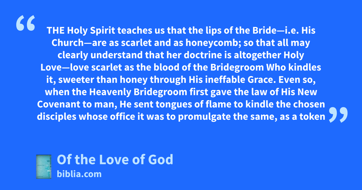 THE Holy Spirit teaches us that the lips of the Bride—i.e. His Church—are as scarlet and as honeycomb; so that all may clearly understand that her doctrine is altogether Holy Love—love scarlet as the blood of the Bridegroom Who kindles it, sweeter than honey through His ineffable Grace. Even so, when the Heavenly Bridegroom first gave the law of His New Covenant to man, He sent tongues of flame to kindle the chosen disciples whose office it was to promulgate the same, as a token