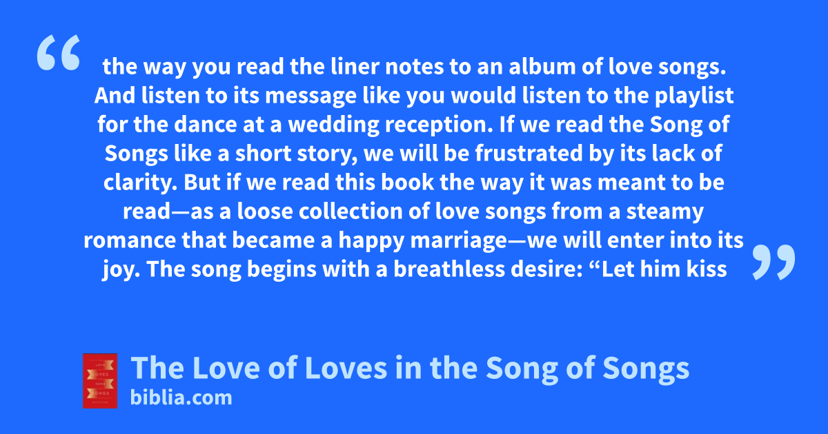 the way you read the liner notes to an album of love songs. And listen to its message like you would listen to the playlist for the dance at a wedding reception. If we read the Song of Songs like a short story, we will be frustrated by its lack of clarity. But if we read this book the way it was meant to be read—as a loose collection of love songs from a steamy romance that became a happy marriage—we will enter into its joy. The song begins with a breathless desire: “Let him kiss