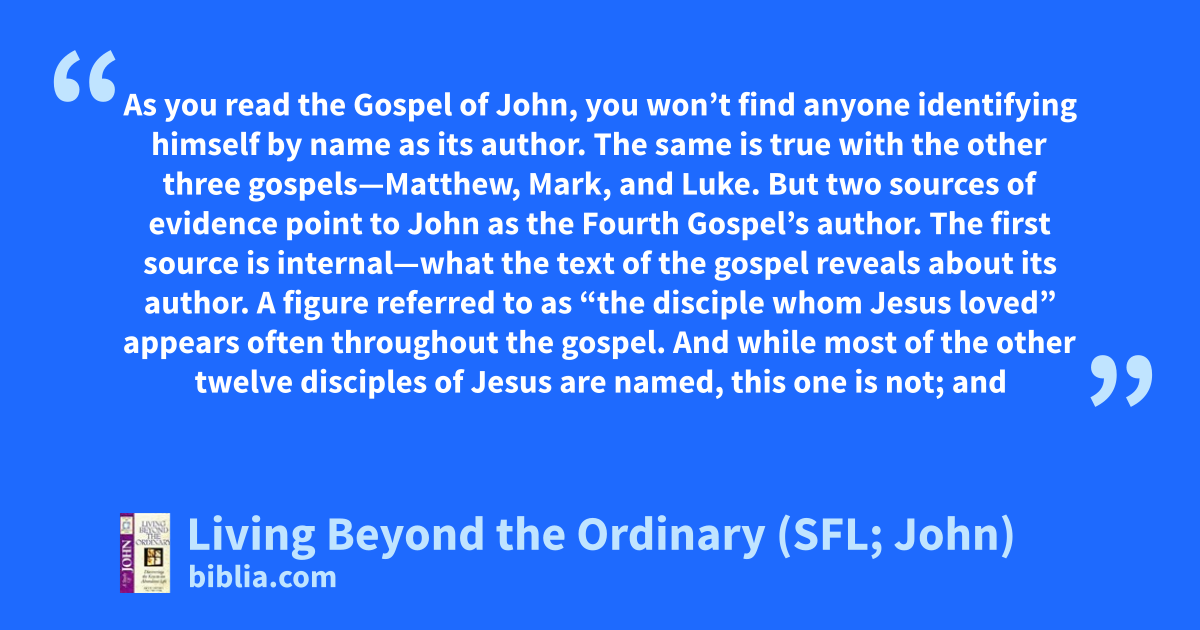 As you read the Gospel of John, you won’t find anyone identifying himself by name as its author. The same is true with the other three gospels—Matthew, Mark, and Luke. But two sources of evidence point to John as the Fourth Gospel’s author. The first source is internal—what the text of the gospel reveals about its author. A figure referred to as “the disciple whom Jesus loved” appears often throughout the gospel. And while most of the other twelve disciples of Jesus are named, this one is not; and