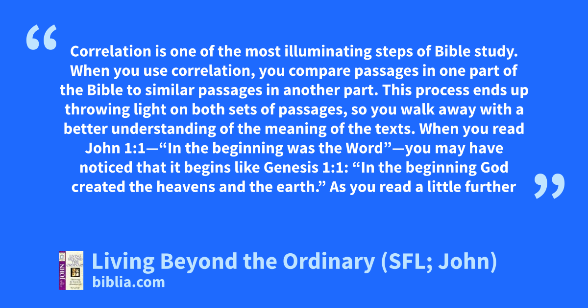 Correlation is one of the most illuminating steps of Bible study. When you use correlation, you compare passages in one part of the Bible to similar passages in another part. This process ends up throwing light on both sets of passages, so you walk away with a better understanding of the meaning of the texts. When you read John 1:1—“In the beginning was the Word”—you may have noticed that it begins like Genesis 1:1: “In the beginning God created the heavens and the earth.” As you read a little further
