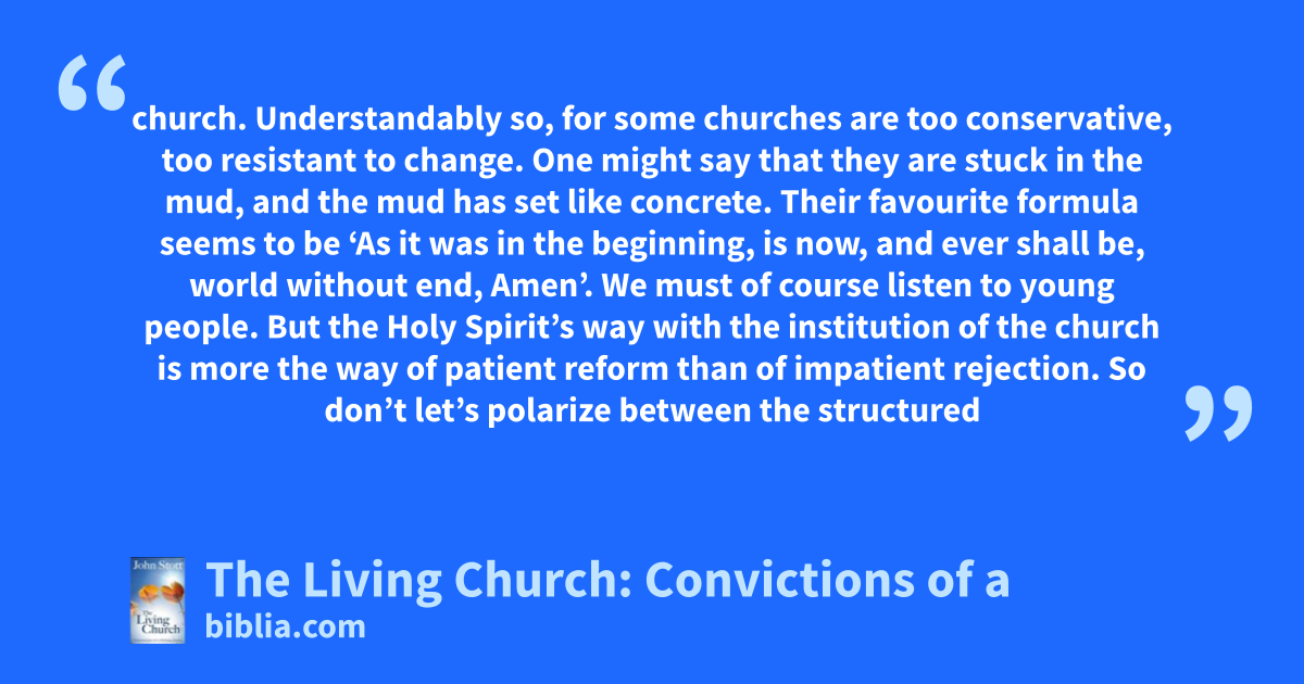 church. Understandably so, for some churches are too conservative, too resistant to change. One might say that they are stuck in the mud, and the mud has set like concrete. Their favourite formula seems to be ‘As it was in the beginning, is now, and ever shall be, world without end, Amen’. We must of course listen to young people. But the Holy Spirit’s way with the institution of the church is more the way of patient reform than of impatient rejection. So don’t let’s polarize between the structured