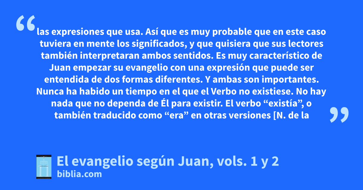 las expresiones que usa. Así que es muy probable que en este caso tuviera en mente los significados, y que quisiera que sus lectores también interpretaran ambos sentidos. Es muy característico de Juan empezar su evangelio con una expresión que puede ser entendida de dos formas diferentes. Y ambas son importantes. Nunca ha habido un tiempo en el que el Verbo no existiese. No hay nada que no dependa de Él para existir. El verbo “existía”, o también traducido como “era” en otras versiones [N. de la