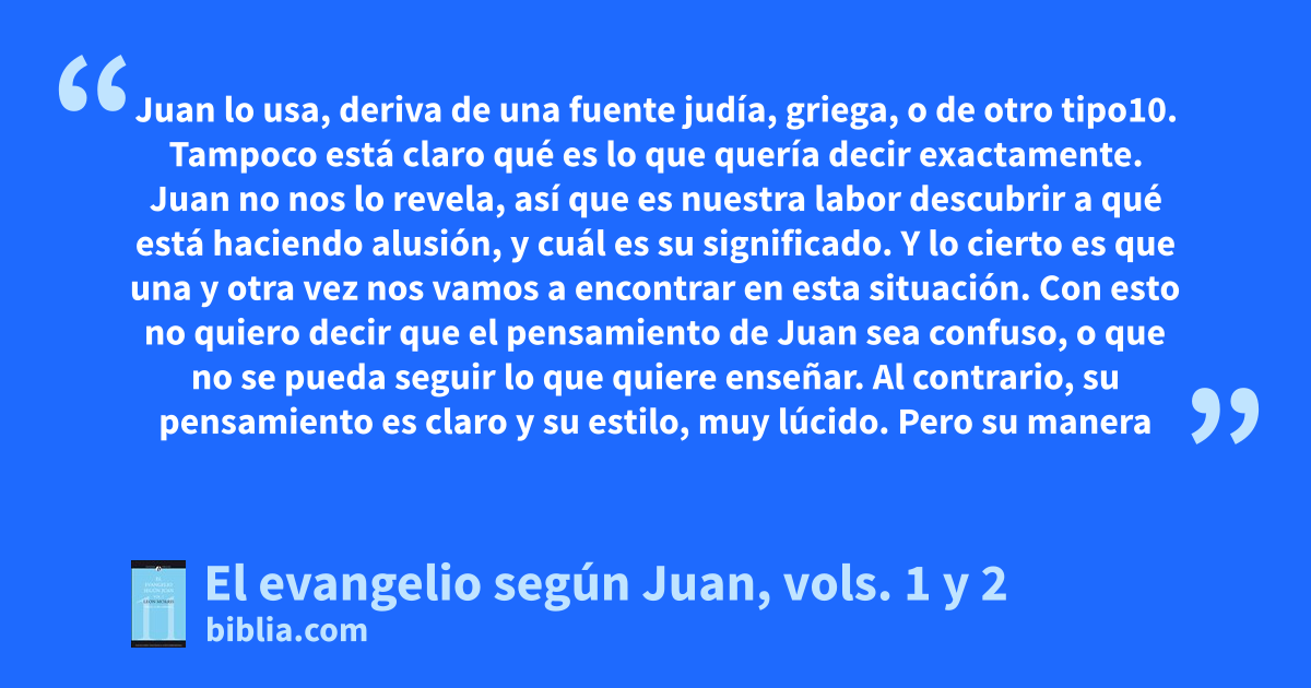 Juan lo usa, deriva de una fuente judía, griega, o de otro tipo10. Tampoco está claro qué es lo que quería decir exactamente. Juan no nos lo revela, así que es nuestra labor descubrir a qué está haciendo alusión, y cuál es su significado. Y lo cierto es que una y otra vez nos vamos a encontrar en esta situación. Con esto no quiero decir que el pensamiento de Juan sea confuso, o que no se pueda seguir lo que quiere enseñar. Al contrario, su pensamiento es claro y su estilo, muy lúcido. Pero su manera