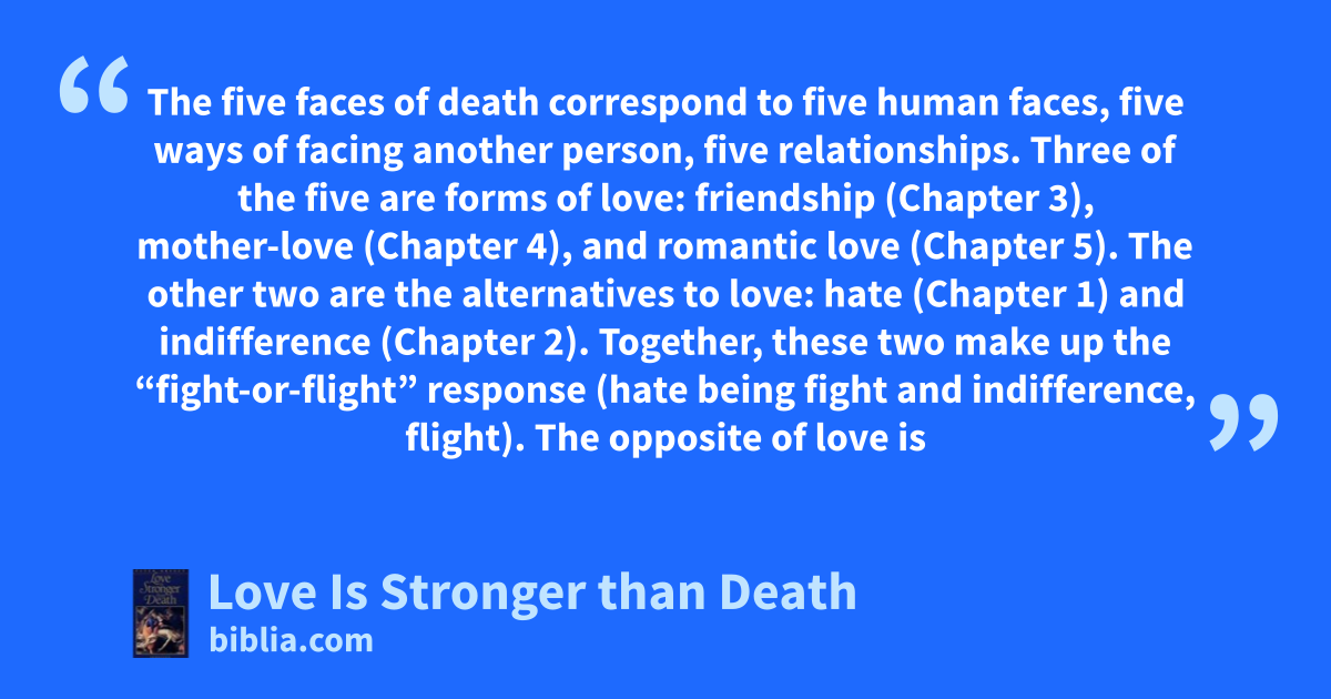 The five faces of death correspond to five human faces, five ways of facing another person, five relationships. Three of the five are forms of love: friendship (Chapter 3), mother-love (Chapter 4), and romantic love (Chapter 5). The other two are the alternatives to love: hate (Chapter 1) and indifference (Chapter 2). Together, these two make up the “fight-or-flight” response (hate being fight and indifference, flight). The opposite of love is