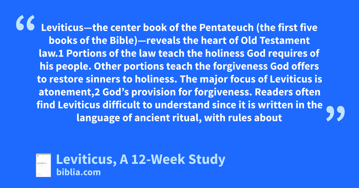 Leviticus—the center book of the Pentateuch (the first five books of the Bible)—reveals the heart of Old Testament law.1 Portions of the law teach the holiness God requires of his people. Other portions teach the forgiveness God offers to restore sinners to holiness. The major focus of Leviticus is atonement,2 God’s provision for forgiveness. Readers often find Leviticus difficult to understand since it is written in the language of ancient ritual, with rules about