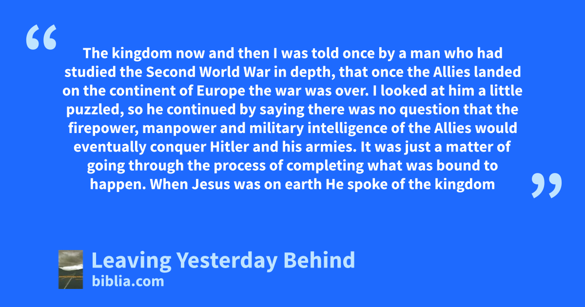 The kingdom now and then I was told once by a man who had studied the Second World War in depth, that once the Allies landed on the continent of Europe the war was over. I looked at him a little puzzled, so he continued by saying there was no question that the firepower, manpower and military intelligence of the Allies would eventually conquer Hitler and his armies. It was just a matter of going through the process of completing what was bound to happen. When Jesus was on earth He spoke of the kingdom
