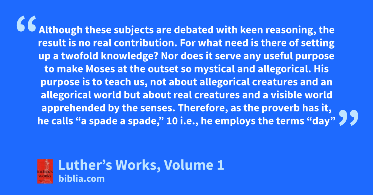 Although these subjects are debated with keen reasoning, the result is no real contribution. For what need is there of setting up a twofold knowledge? Nor does it serve any useful purpose to make Moses at the outset so mystical and allegorical. His purpose is to teach us, not about allegorical creatures and an allegorical world but about real creatures and a visible world apprehended by the senses. Therefore, as the proverb has it, he calls “a spade a spade,” 10 i.e., he employs the terms “day”
