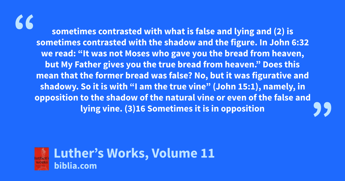 sometimes contrasted with what is false and lying and (2) is sometimes contrasted with the shadow and the figure. In John 6:32 we read: “It was not Moses who gave you the bread from heaven, but My Father gives you the true bread from heaven.” Does this mean that the former bread was false? No, but it was figurative and shadowy. So it is with “I am the true vine” (John 15:1), namely, in opposition to the shadow of the natural vine or even of the false and lying vine. (3)16 Sometimes it is in opposition